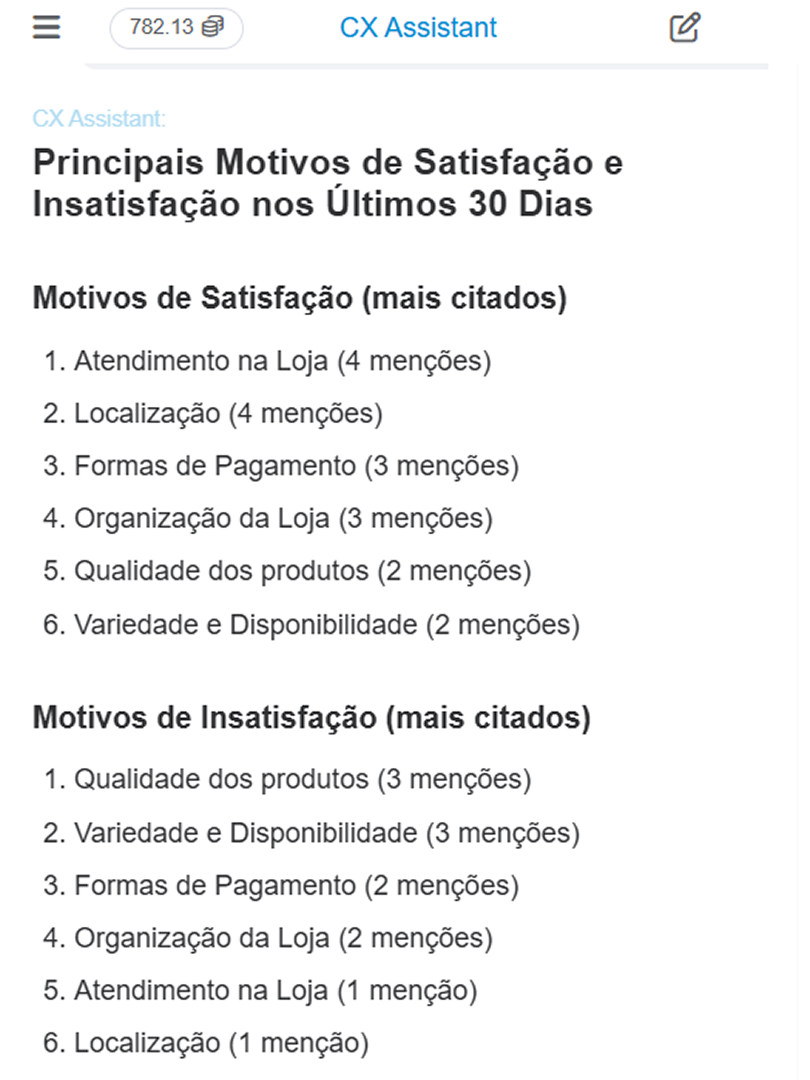 Prompt para copiar: Quais são os principais motivos de satisfação e insatisfação para [segmento/produto/unidade] nos últimos 30 dias?