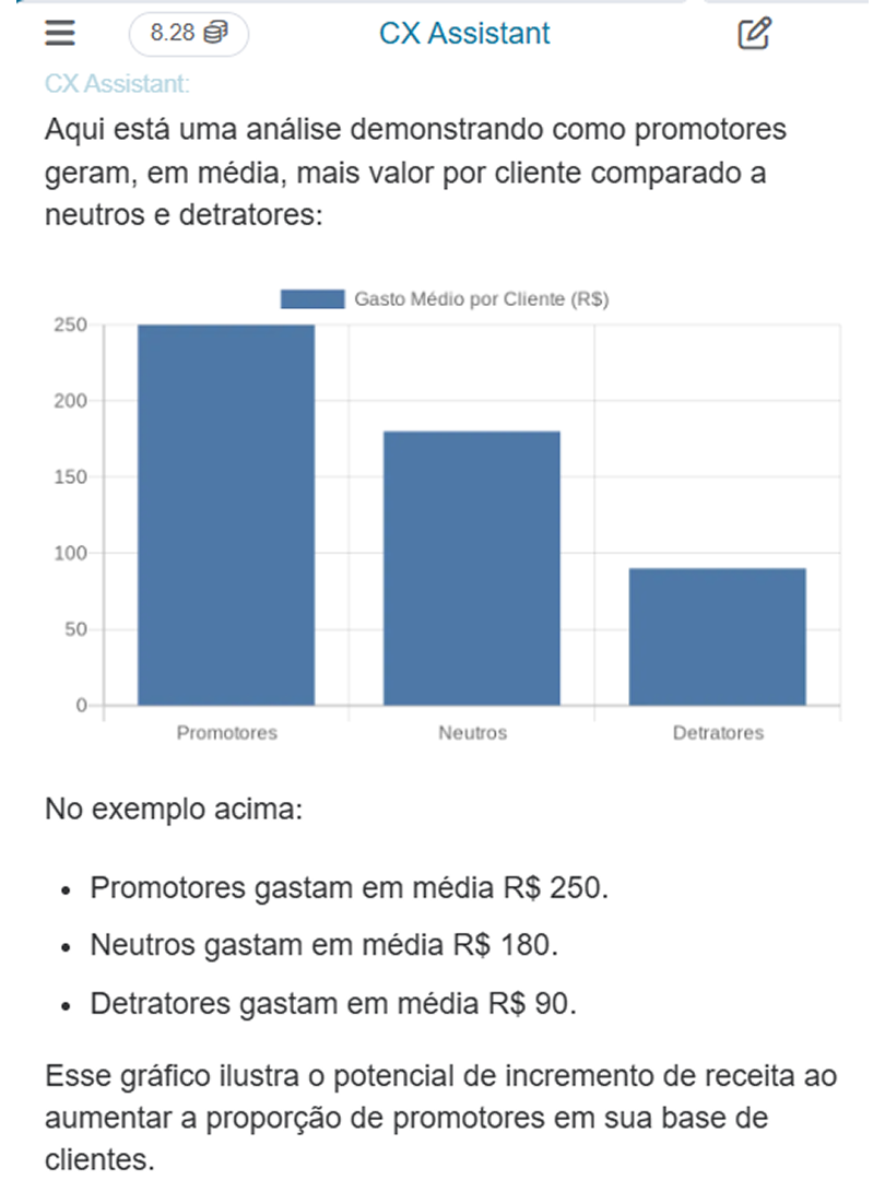 Com base nas métricas da sua base, o CX Assistant consegue estimar a diferença média de gasto, churn e recorrência entre clientes promotores e detratores — mostrando o retorno direto que investir em CX gera para o negócio.