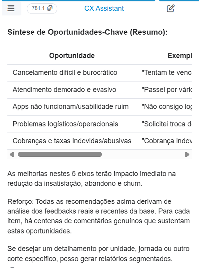 O CX Assistant consolida dados estruturados e não estruturados e entrega um resumo executivo com prioridades, apontando onde agir primeiro e o que está funcionando bem.
