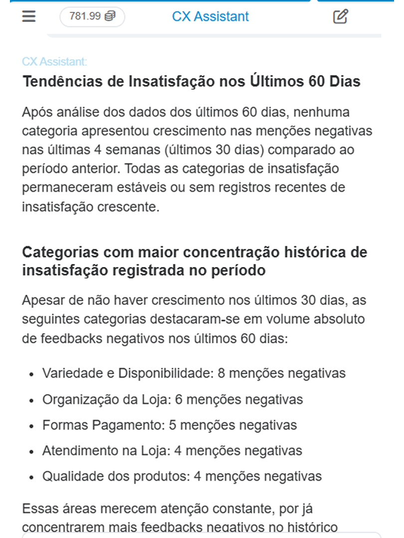 Com esse prompt, o CX Assistant cruza dados de Likes & Dislikes, comentários abertos e classificações automáticas por IA para mostrar o que realmente está impactando seus resultados.