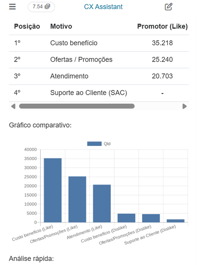 Por exemplo, o CX Assistant pode identificar que uma unidade tem o NPS 8 pontos abaixo da média por causa de atrasos logísticos, enquanto outra se destaca pelo atendimento humanizado.